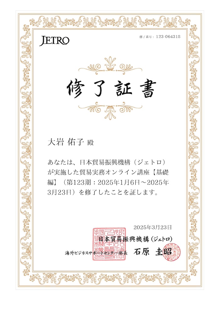 JETRO貿易実務講座 基礎編修了
